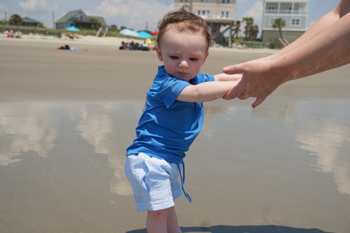Contrary to the look on his face, he did not hate the water. He did hate the way the sand disappears from under your feet with the tide. I don’t blame him.