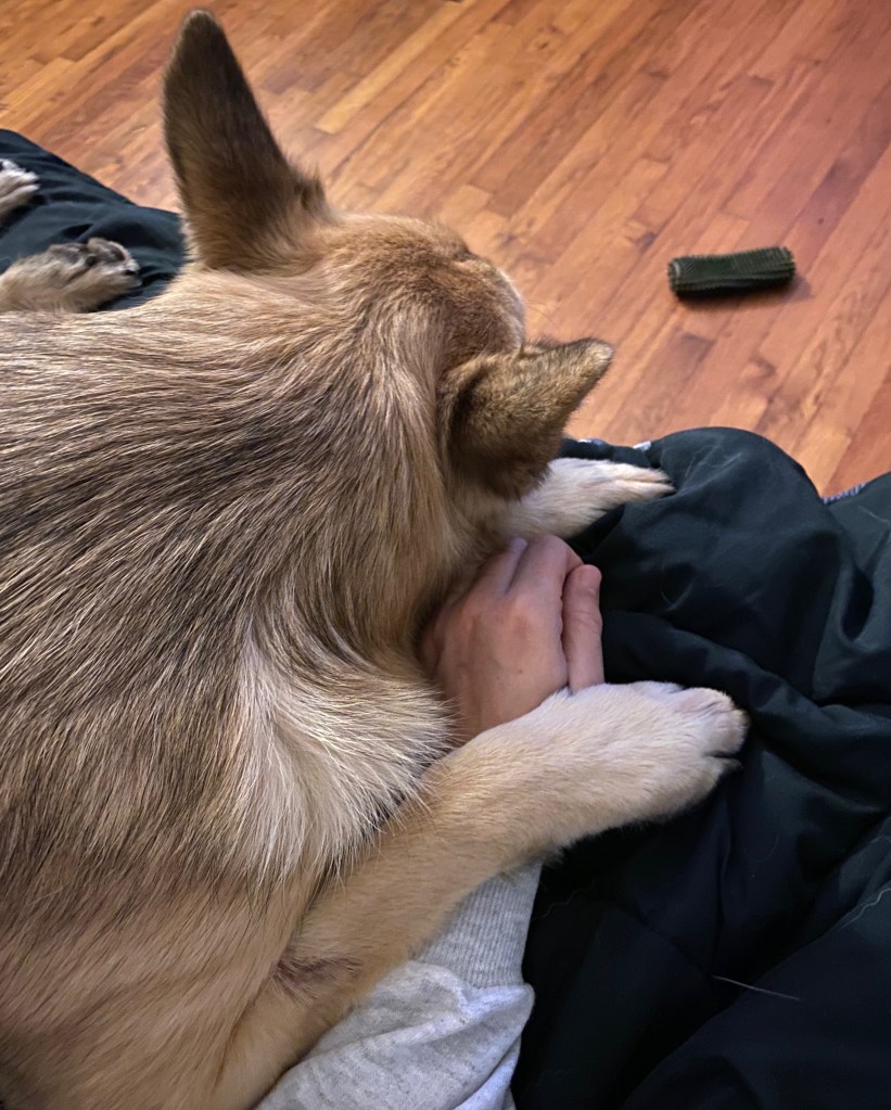 Charlie is a sweetheart too. She’s actually the love bug. She’d be happy to stay inside 24/7 and lounge around with her humans. Sampson is happiest outside. Both dogs eat well – no people food. They have zero idea what to do with it.