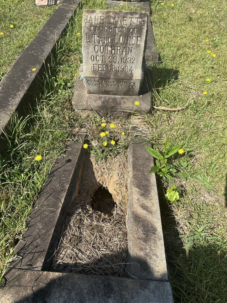 I’m not going into detail here but we finally made it out to Oakwood Cemetery in Spartanburg – aka – Hell’s Gate! I’ve wanted to go forever. It did not disappoint! The first thing we saw upon arrival? A handful of Cothran graves! Please note the giant hole here. What in the world?!? Or should I say, what not of this world?!?