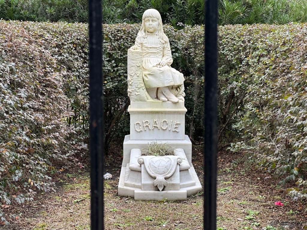 Gracie was the daughter of the manager of one of Savannah’s most beloved hotels. Guests loved to see her bouncing around the lobby while her dad worked. She caught pneumonia in 1889 and died at the age of six. A sculptor carved this life-size statue of Gracie from a photograph.