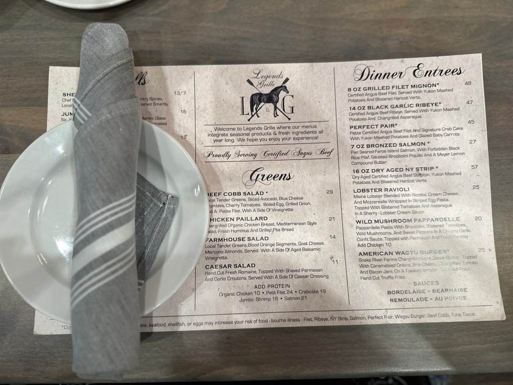 Every time we’ve come, we’ve eaten at Roger’s Diner. I’ve always wanted to try Legends Grill because it looked cool. The prices are a little (a lot) higher but, a lot of times, you get what you pay for. I was hoping it would be worth it.